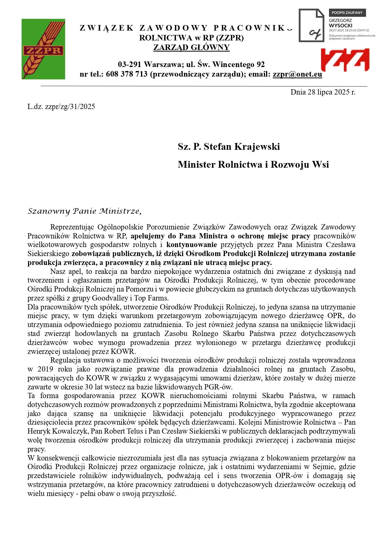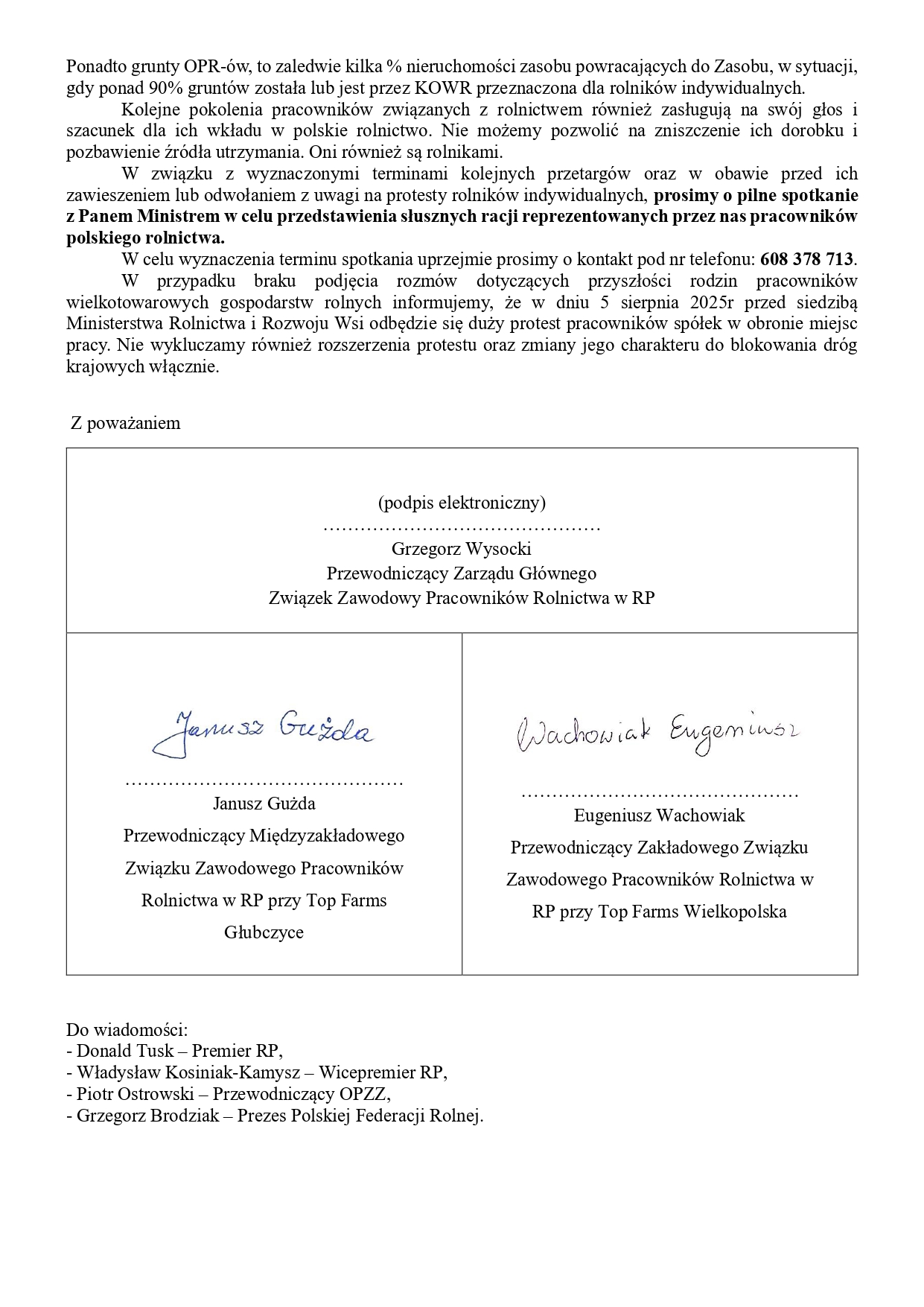 Poniżej publikujemy pełną treść pisma skierowanego do Ministra Rolnictwa i Rozwoju Wsi przez Ogólnopolskie Porozumienie Związków Zawodowych oraz Związek Zawodowy Pracowników Rolnictwa w RP.