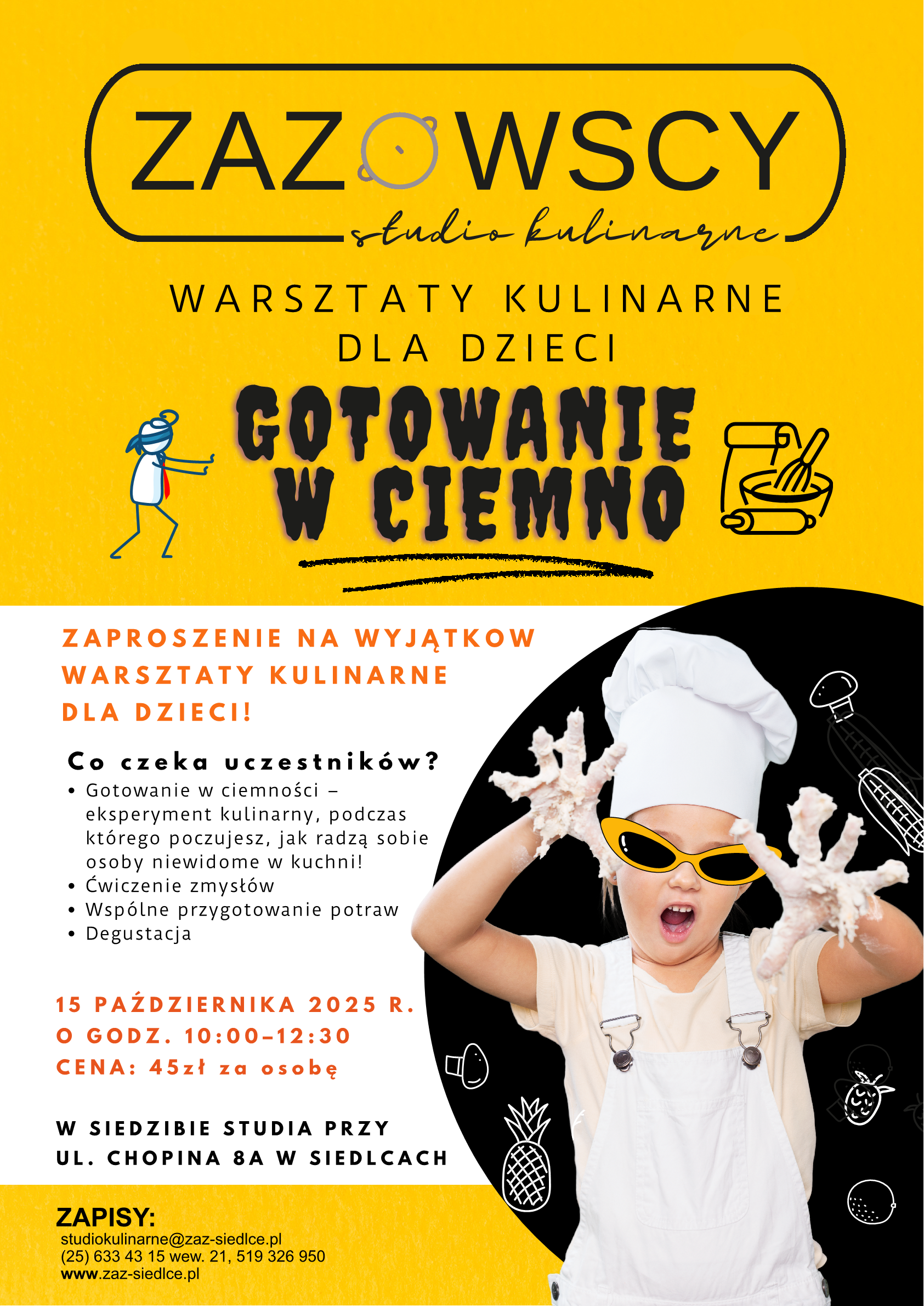 Wyjątkowe warsztaty kulinarne dla dzieci i młodzieży odbędą się w Siedlcach pod hasłem „Gotowanie w ciemno”. Spotkanie, organizowane przez Studio Kulinarne ZAZowscy, pozwoli uczestnikom spróbować swoich sił w kuchni bez użycia wzroku, ucząc empatii, współpracy i otwartości na potrzeby innych. Zajęcia zaplanowano na 15 października.