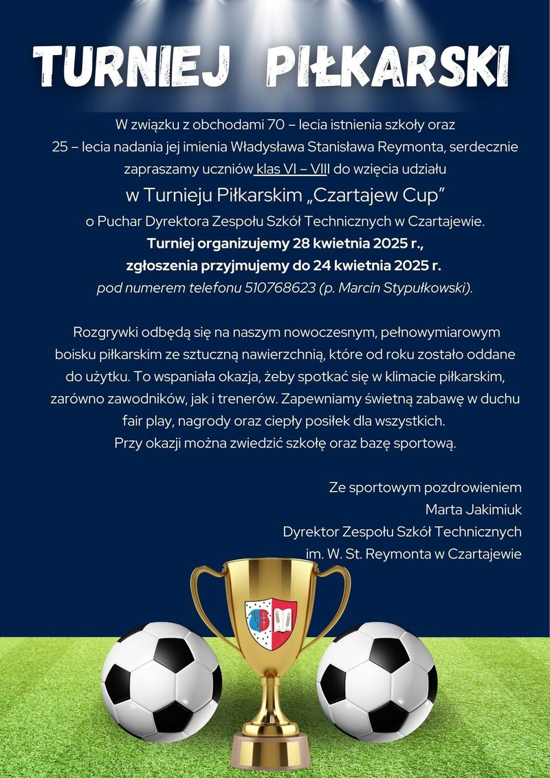 W Czartajewie odbędzie się Turniej Piłkarski „Czartajew Cup” o Puchar Dyrektora Zespołu Szkół Technicznych w Czartajewie. Wydarzenie to stanowi kolejny element obchodów 70-lecia powstania szkoły oraz 25-lecia nadania jej imienia Władysława Stanisława Reymonta.