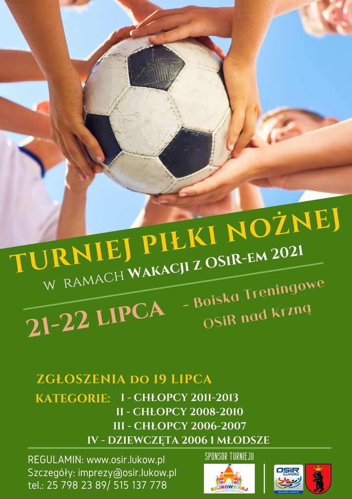 Turniej Piłki Nożnej organizowany jest w ramach „Wakacji z OSiR-em”. Zaplanowano go na 21 i 22 lipca. Mecze będą rozgrywane na boisku treningowym OSiR nad Krzną. Młodzi piłkarze będą rywalizować pomiędzy sobą w czterech kategoriach wiekowych: grupa I chłopcy 2011 – 2013, grupa II chłopcy 2008 – 2010, grupa III chłopcy 2006 – 2007 oraz grupa IV dziewczęta 2006 i młodsze.Zapisy przyjmowane są w biurze OSiR. Termin zgłaszania się drużyn upływa 19 lipca.