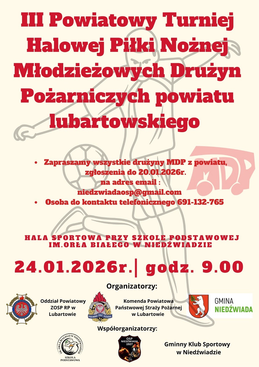 III Powiatowy Turniej Halowej Piłki Nożnej Młodzieżowych Drużyn Pożarniczych odbędzie się w hali sportowej przy Szkole Podstawowej im. Orła Białego w Niedźwiadzie i będzie doskonałą okazją do sportowej rywalizacji, integracji młodych druhów oraz promowania idei pożarnictwa wśród dzieci i młodzieży. Do udziału zaproszone są drużyny MDP działające przy jednostkach OSP z całego powiatu. Rozgrywki mają nie tylko charakter rywalizacji, ale przede wszystkim ważne jest wzmocnienie współpracy oraz zaangażowania młodego pokolenia strażaków ochotników.Zgłoszenia drużyn przyjmowane są do 20 stycznia na adres email: niedzwiadaosp@gmail.com