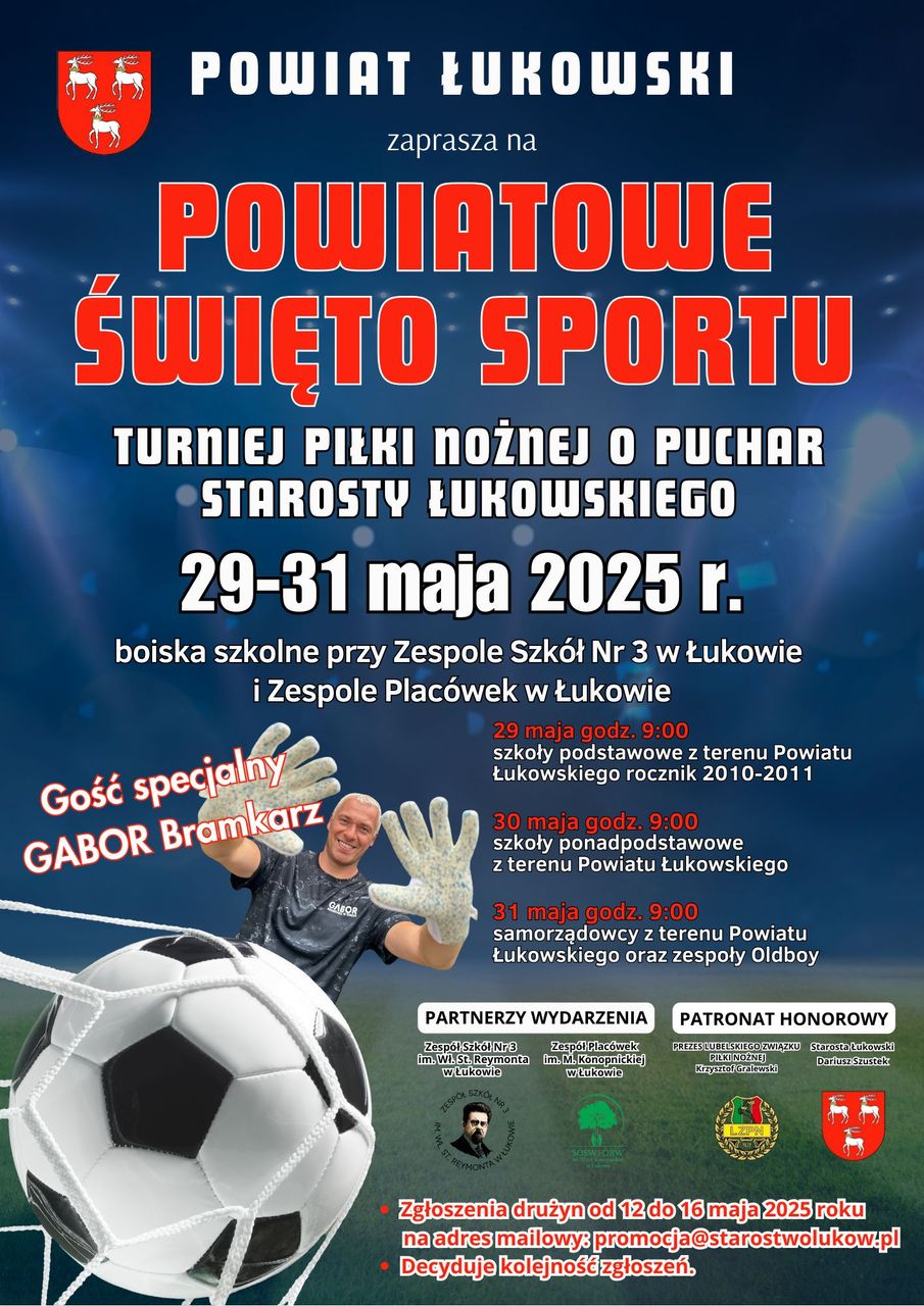 Powiatowe Święto Sportu rozpoczyna się dziś, 29 maja i potrwa do soboty, 31 maja. Dziś, w czwartek na nowym boisku przy Zespole Szkół nr 3 w Łukowie spotkają się uczniowie ze szkół podstawowych z rocznika 2010 – 2011, z terenu całego powiatu łukowskiego. W piątek grać będą uczniowie szkół średnich. Natomiast w sobotę na boisku spotkają się samorządowcy oraz zespoły oldboy. Zwycięzcy w każdej kategorii otrzymają Puchar Starosty Łukowskiego oraz medale.Jak mówi Radiu Podlasie Sławomir Rzymowski, członek Zarządu Powiatu, ma być to wydarzenie łączące pokolenia i integrujące lokalną społeczność. I jak dodaje, gościem specjalnym będzie Gabor Bramkarz, czyli Grzegorz Jędrzejewski, znany z wyjątkowego podejścia do treningów bramkarskich i pasji do piłki nożnej.