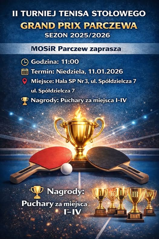 Już w najbliższą niedzielę, 11 stycznia,Miejski Ośrodek Sportu i Rekreacji w Parczewie zaprasza młodzież oraz osoby dorosłe do udziału w II Turnieju Tenisa Stołowego o Grand Prix Parczewa w kategoriach open kobiet i mężczyzn. Turniej rozpocznie się o godz. 11:00. Będzie odbywał się w hali sportowej Szkoły Podstawowej nr 3 w Parczewie.Zgłoszenia przyjmowane są bezpośrednio przed turniejem do godz. 11:00.