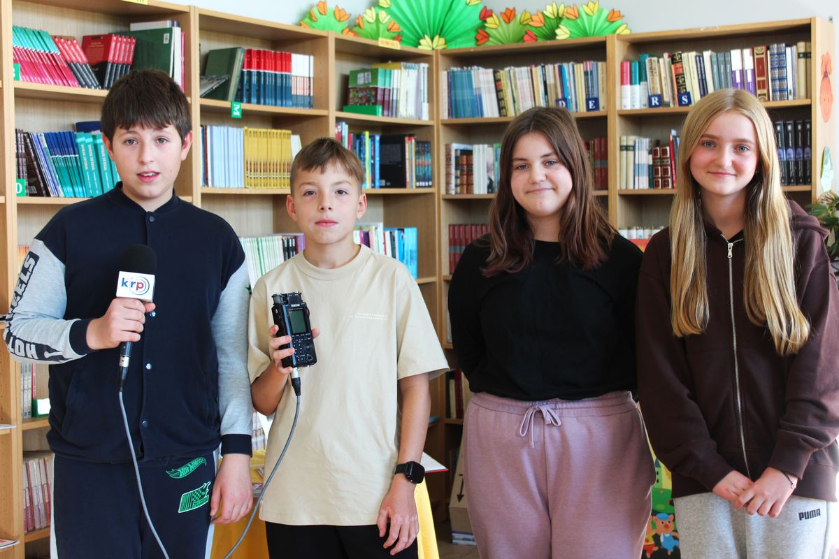 Jak to jest z tym sportem w Perlejewie, sprawdzała Agnieszka Bolewska-Iwaniuk. Przy mikrofonie: Aneta Leszczyńska, dyrektor placówki, Grzegorz Czarkowski, nauczyciel wychowania fizycznego oraz szóstoklasiści: Kuba, Adam, Gabrysia i Ania: