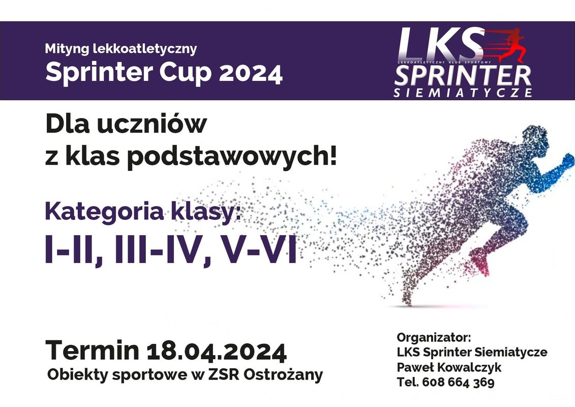 Lekkoatletyczny Klub Sportowy „Sprinter” Siemiatycze zaprasza na I Mityng Lekkoatletyczny „Sprinter – Cup”. Wydarzenie odbędzie się w czwartek, 18 kwietnia na obiektach sportowych Zespół Szkół Rolniczych im. Wincentego Witosa w Ostrożanach.