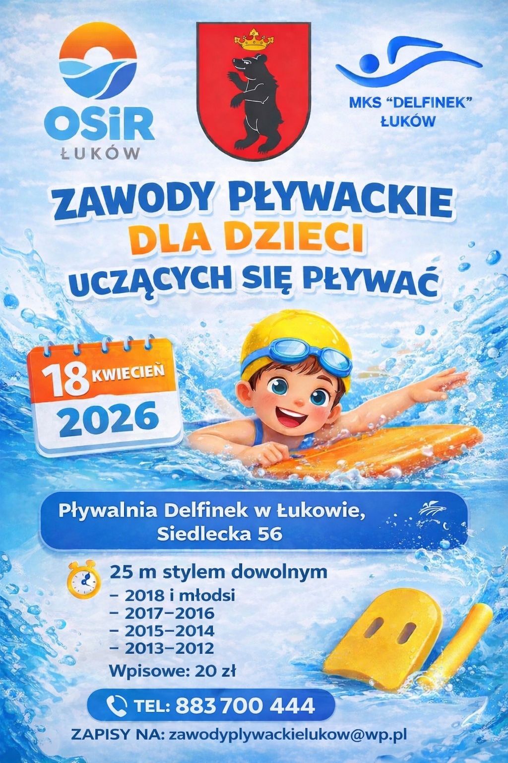 Zawody pływackie dla dzieci, które uczą się pływać, rozegrane zostaną w sobotę, 18 kwietnia na pływalni krytej „Delfinek” w Łukowie. Do udział w nich zaproszeni są młodzi pływacy z roczników od 2012 do 2018. Będą oni mieli do pokonania dystans 25 metrów stylem dowolnym.Zapisy przyjmowane są pod adresem zawodyplywackielukow@wp.pl oraz telefoniczne pod numerem 883 700 444. Wpisowe wynosi 20 zł.